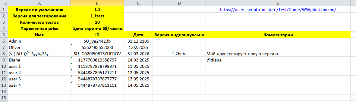 Наша система предоставляет продвинутый контроль не только над кто имеет доступ, но и над какую версию скрипта они получают. Всё управляется через файл users.xlsx на вашем FTP.